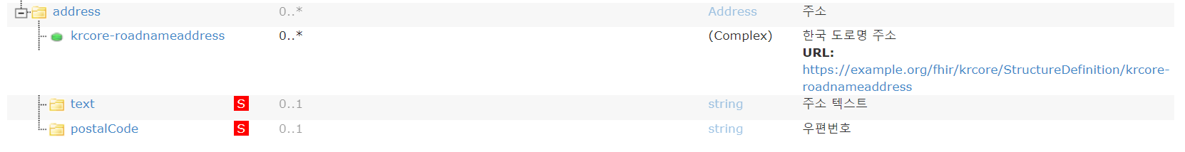예를 들면, KR Core Patient Profile의 address 요소는 필수 지원 요소가 아니지만, 그 하위 요소인 “text”와 “postalCode”는 지원으로 표시(S)되어 있다. 이 Profile을 준수하는 경우,