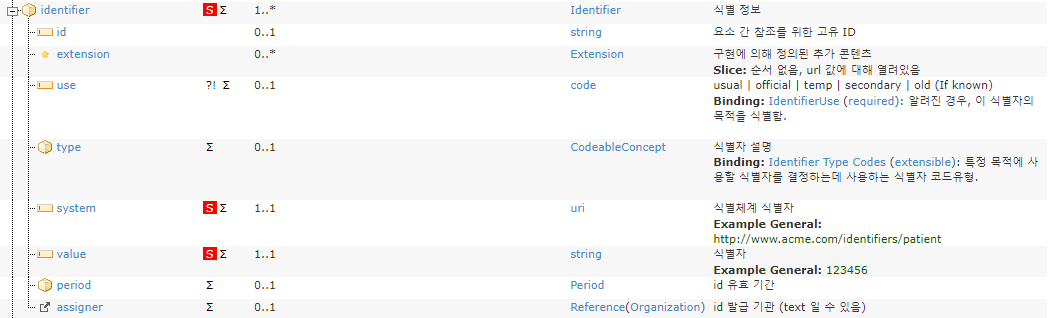 예를 들면, KR Core Patient Profile의 identifier 요소는 필수 지원으로 표시(S)되어 있고 하위 필수 지원 요소로 “system”과 “value”를 가지고 있다. 이 Profile을 준수하는 경우,